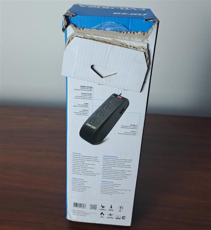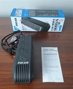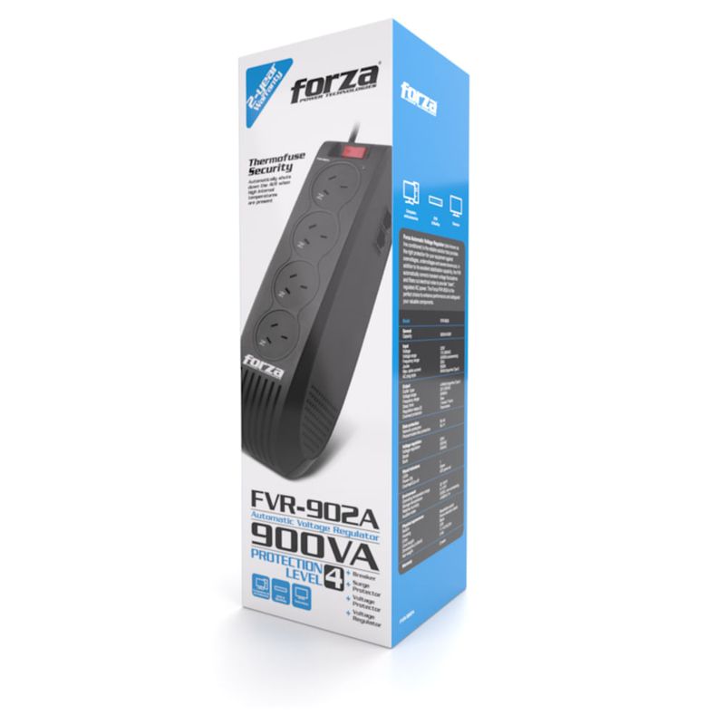 <br/>Producto Outlet* Producto Abierto, Packaging Dañado<br/><br/><span style="font-size:14px">El regulador automático de voltaje Forza FVR-902A ofrece protección confiable contra sobretensiones y caídas de tensión para tus equipos electrónicos. Con una capacidad de 900VA/450W, corrige automáticamente las fluctuaciones de voltaje y filtra el ruido eléctrico para un suministro de energía limpio y estable.</span><br/><strong style="font-size:14px">Especificaciones:</strong><ul><li><strong style="font-size:14px">Modelo:</strong><span style="font-size:14px"> FVR-902A</span></li><li><strong style="font-size:14px">Capacidad:</strong><span style="font-size:14px"> 900VA / 450W</span></li><li><strong style="font-size:14px">Entrada:</strong></li><li><span style="font-size:14px">Tensión: 220V</span></li><li><span style="font-size:14px">Margen de tensión: 172-268VCA</span></li><li><span style="font-size:14px">Frecuencia: 50/60Hz (detección automática)</span></li><li><strong style="font-size:14px">Protección:</strong></li><li><span style="font-size:14px">Joules: 200J</span></li><li><span style="font-size:14px">Corriente máxima de protección: 6000A</span></li><li><strong style="font-size:14px">Salida:</strong></li><li><span style="font-size:14px">Tomas de salida: 4 (IRAM Argentino Tipo I)</span></li><li><span style="font-size:14px">Margen de tensión: 207-268VCA</span></li><li><span style="font-size:14px">Frecuencia: 50/60Hz</span></li><li><strong style="font-size:14px">Enchufe:</strong><span style="font-size:14px"> IRAM (Argentino Tipo I)</span></li><li><strong style="font-size:14px">Temporizador de retardo:</strong><span style="font-size:14px"> 2 seg</span></li><li><strong style="font-size:14px">Pasos de regulación:</strong><span style="font-size:14px"> 1 elevación/ 1 atenuación</span></li><li><strong style="font-size:14px">Protección:</strong></li><li><span style="font-size:14px">Contra sobrecarga (Termofusible)</span></li><li><span style="font-size:14px">Para datos (RJ45)</span></li><li><strong style="font-size:14px">Regulación de Tensión:</strong></li><li><span style="font-size:14px">Elevación: 202VCA</span></li><li><span style="font-size:14px">Atenuación: 246VCA</span></li><li><strong style="font-size:14px">Indicadores LED:</strong></li><li><span style="font-size:14px">Luz de conexión: Verde</span></li><li><span style="font-size:14px">Recalentamiento/Temperatura de corte: Se extingue la luz LED</span></li><li><strong style="font-size:14px">Ambiente:</strong></li><li><span style="font-size:14px">Temperatura de funcionamiento: 0-40ºC</span></li><li><span style="font-size:14px">Temperatura de almacenamiento: -15-45ºC</span></li><li><span style="font-size:14px">Humedad relativa: 0-95% no condensada</span></li><li><span style="font-size:14px">Ruido audible: <40dB a un metro</span></li><li><strong style="font-size:14px">Dimensiones:</strong><span style="font-size:14px"> 28,2x8,8x8,8cm</span></li><li><strong style="font-size:14px">Peso:</strong><span style="font-size:14px"> 1,1kg</span></li><li><strong style="font-size:14px">Cubierta:</strong><span style="font-size:14px"> Plástico retardador de llama</span></li><li><strong style="font-size:14px">Longitud del cable:</strong><span style="font-size:14px"> 1,2m</span></li><li><strong style="font-size:14px">Garantía:</strong><span style="font-size:14px"> Dos años</span></li></ul>