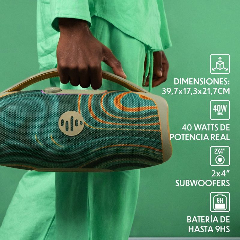 El Stromberg Force redefine la experiencia sonora con sus 40 Watts RMS y bajos profundos. Su diseño innovador, fruto de una colaboración exclusiva con el diseñador Agust, lo convierte en una pieza de moda que acompaña tu estilo musical a donde vayas.