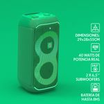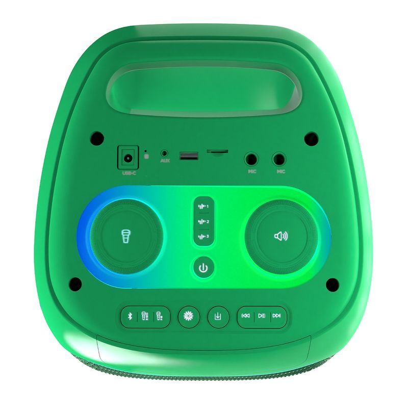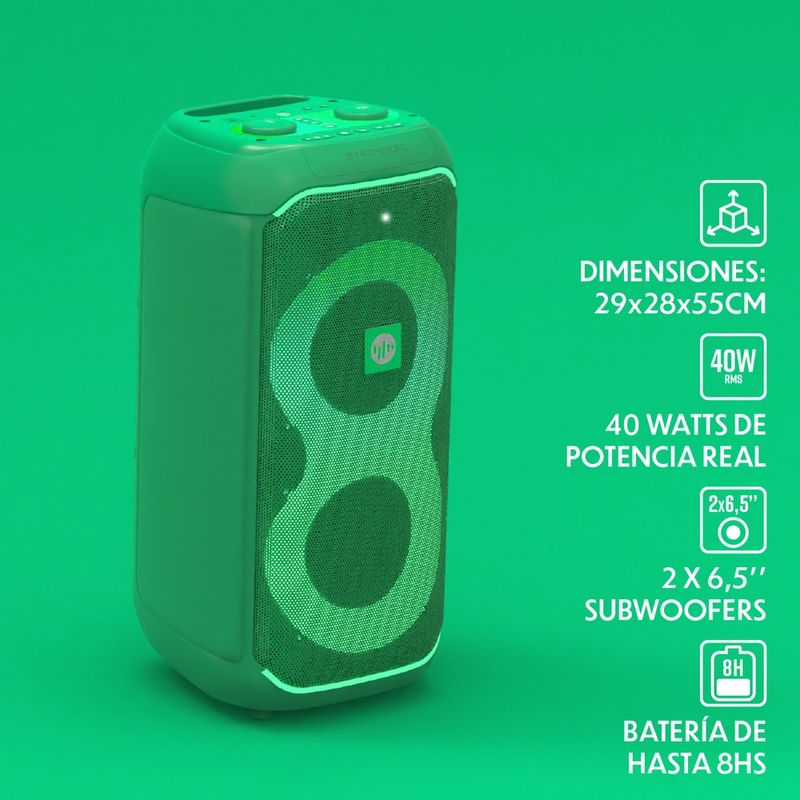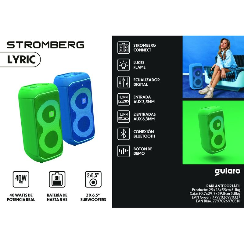 El Stromberg Lyric no solo ofrece un sonido potente, sino también una gran versatilidad. Cuenta con múltiples opciones de conectividad, incluyendo Bluetooth y entradas auxiliares de 3.5mm y 6.3mm. Su diseño compacto y portátil, disponible en verde y azul, lo convierte en el compañero ideal para cualquier ocasión.