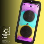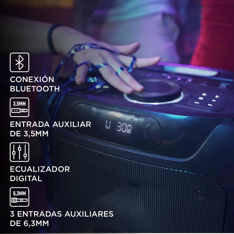 Transforma cualquier reunión en una fiesta inolvidable. Las luces LED RGB se sincronizan al ritmo de la música, mientras que la función de karaoke con efectos de voz te permite desatar tu estrella interior. Además, ajusta los graves y agudos a tu gusto para una experiencia sonora personalizada.