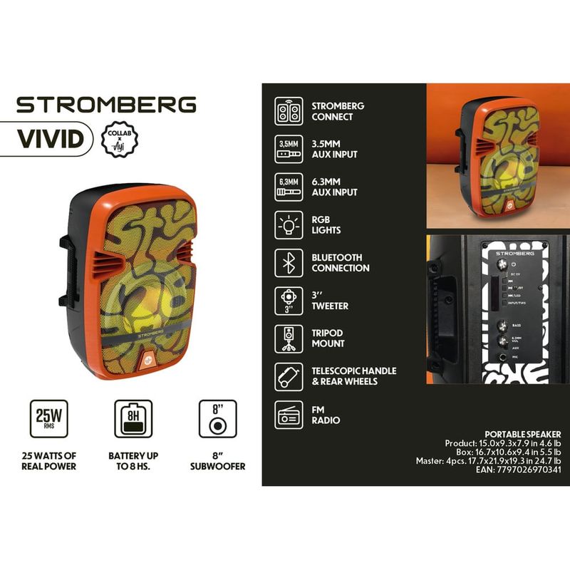 El Stromberg Vivid ofrece 25W RMS de potencia real, combinando un subwoofer de 8” para bajos profundos y un tweeter de 3” para agudos claros, garantizando un audio equilibrado y envolvente. Disfruta de hasta 8 horas de reproducción continua, ideal para animar cualquier reunión o fiesta.