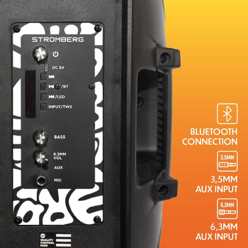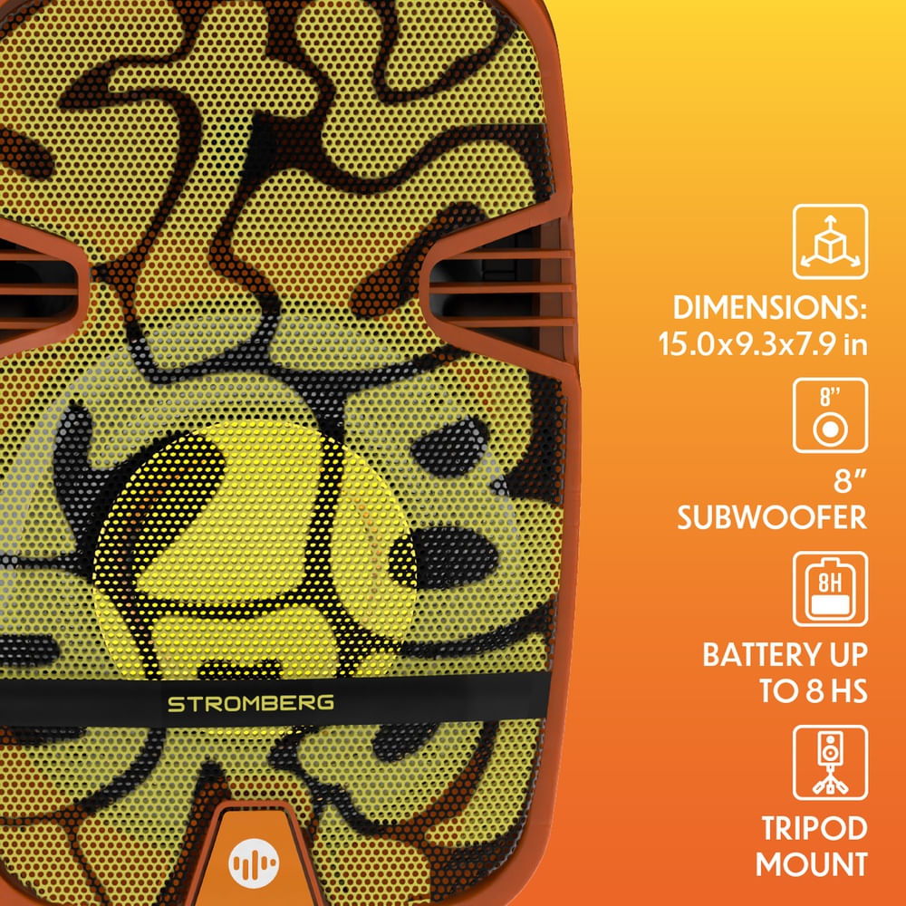 El Stromberg Vivid ofrece 25W RMS de potencia real, combinando un subwoofer de 8” para bajos profundos y un tweeter de 3” para agudos claros, garantizando un audio equilibrado y envolvente. Disfruta de hasta 8 horas de reproducción continua, ideal para animar cualquier reunión o fiesta.