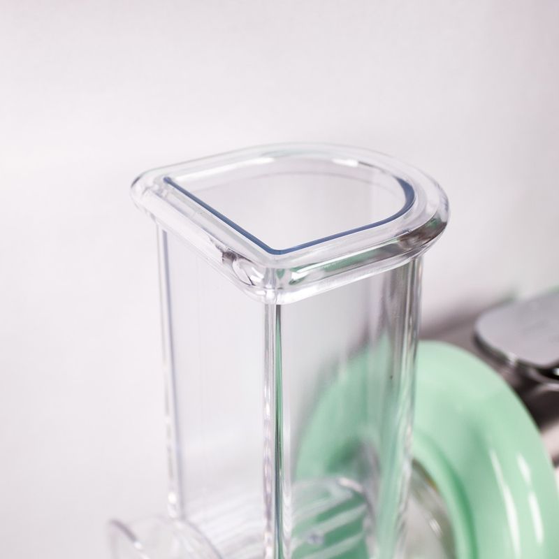 Simplifica la preparación de tus comidas con su operación de un solo botón. El diseño con tubo de alimentación permite que los alimentos rallados caigan directamente en tu recipiente, haciendo el proceso más rápido y limpio.