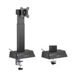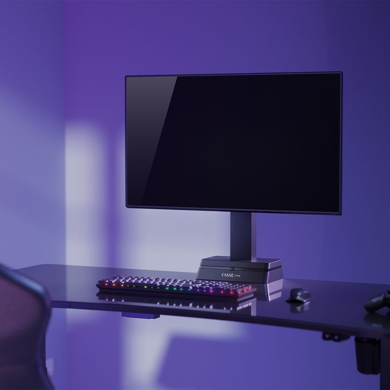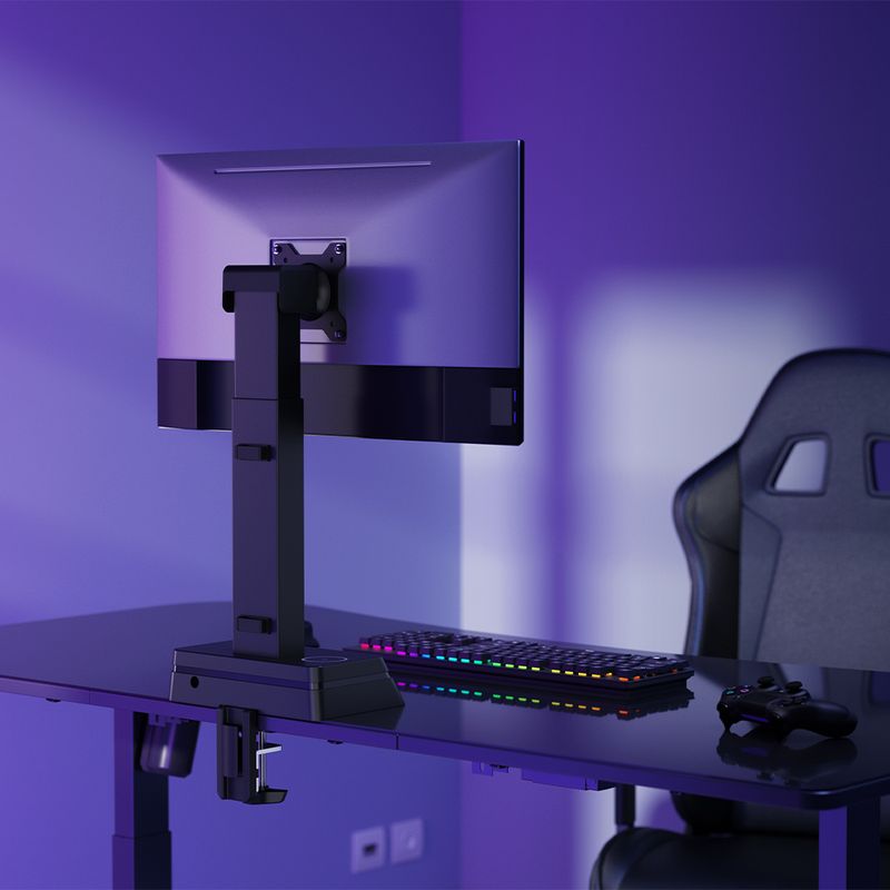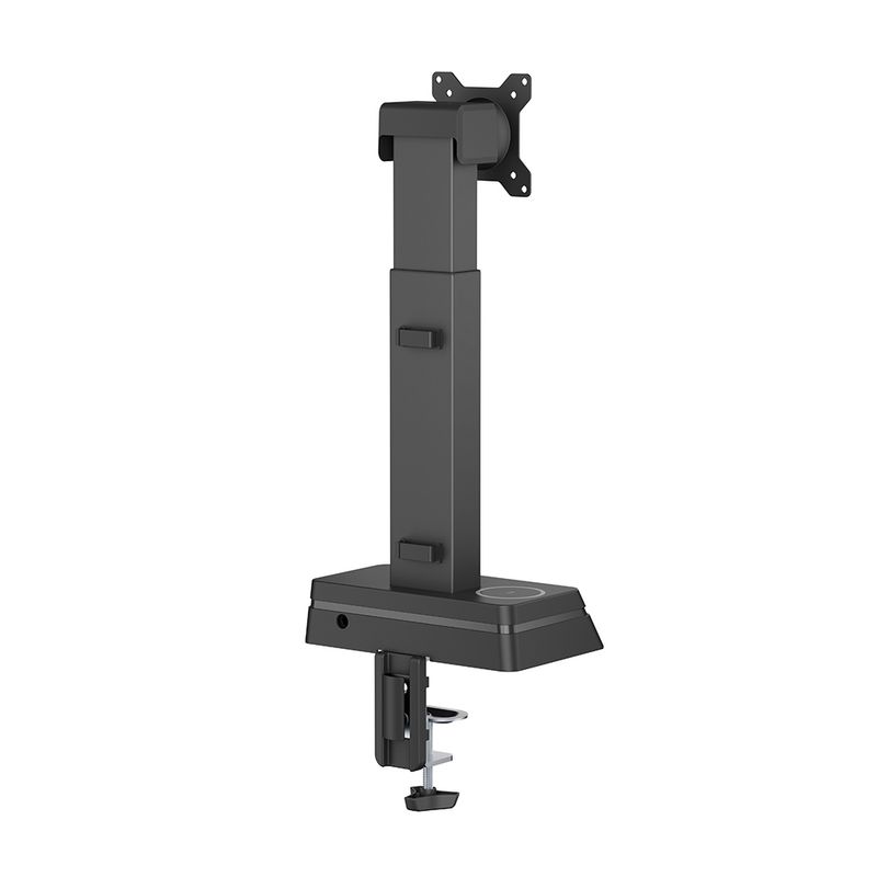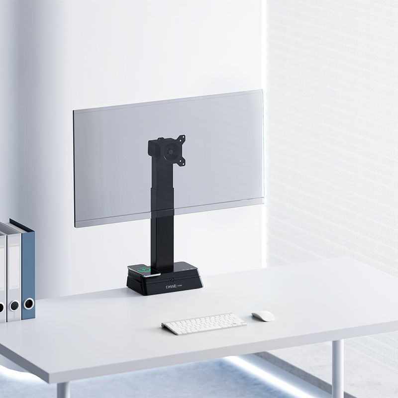 Mantén tu espacio de trabajo ordenado y eficiente. Este soporte cuenta con un cargador inalámbrico integrado para mantener tus dispositivos listos y un sistema de gestión de cables que elimina el desorden.